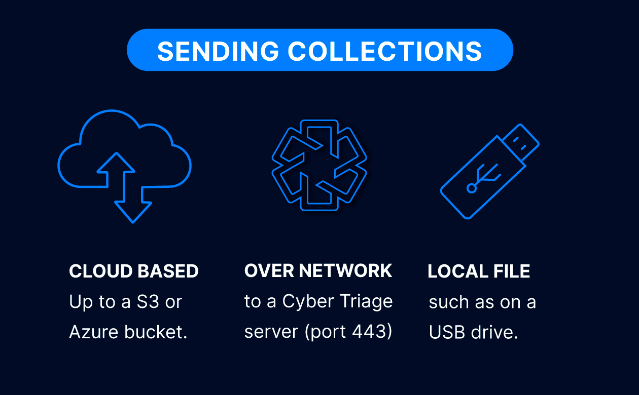 You can save to a local file, upload directly to the Cyber Triage Server, or send to cloud object storage (Amazon S3, other S3 cloud services, or Azure Blob).