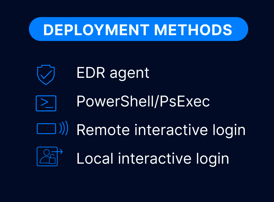 Use an EDR to push and run it (via our Deployer PowerShell script), email/hand it to a user with a simple UI wrapper, or run from a USB/remote share.