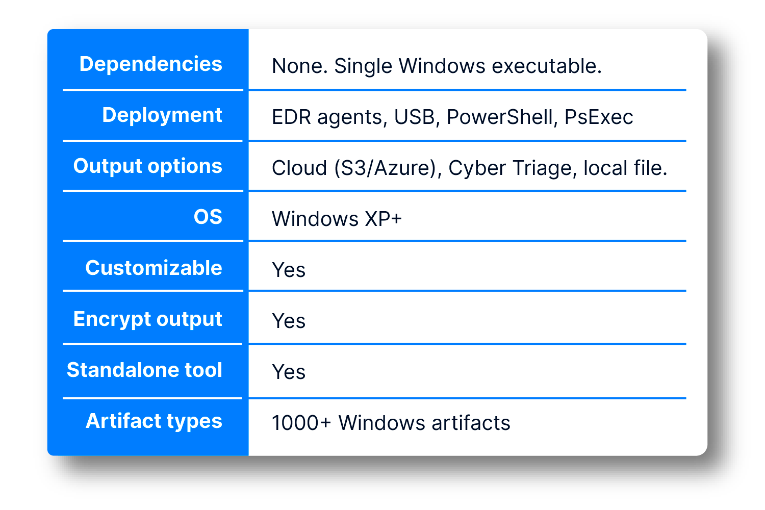 It’s a standalone tool you can deploy via EDR agents, email to your clients, or run from a USB drive. Its output can be sent to a Cyber Triage server, S3 bucket, or saved to a file.