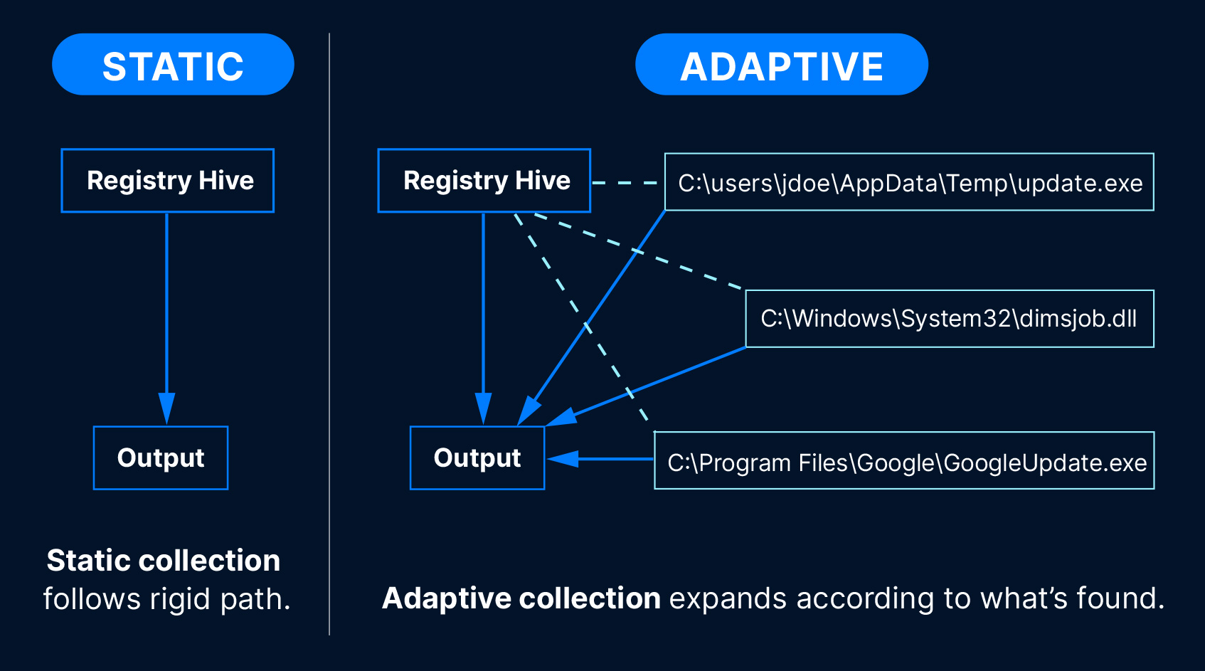 Collections start from rules and dynamically expand based on what’s discovered (e.g., following paths inside artifacts to pull more relevant scripts/executables), maximizing useful evidence with minimal round-trips.