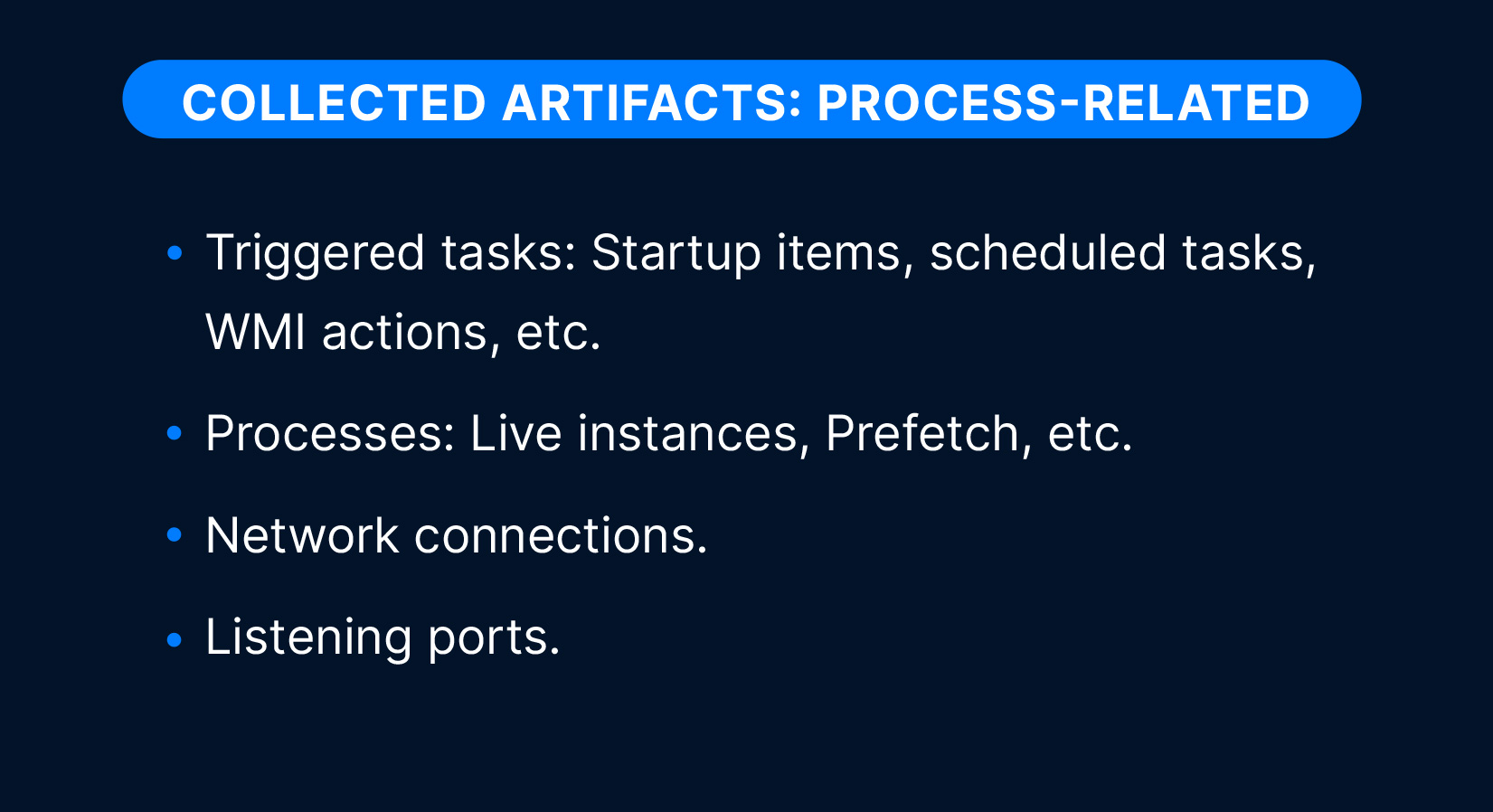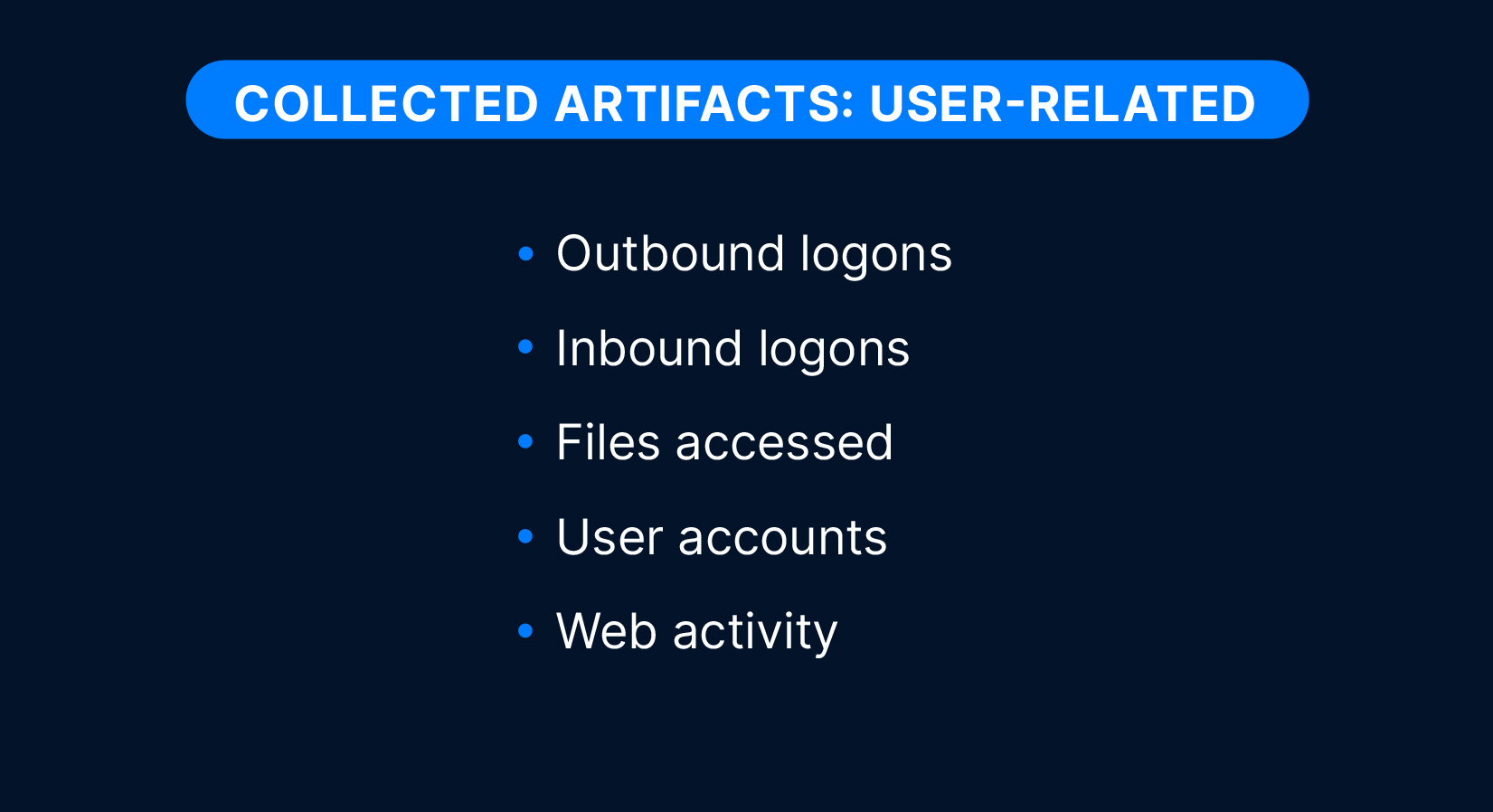 The Collector looks for over 1,000 individual data artifacts ranging from operating system configuration files to application logs. In addition to the standard Windows artifacts (Registry, event logs, Prefetch files, shortcut files, etc.), it uses an adaptive collection algorithm that identifies recently used executables (.exe and .dll). This means that any threat actor tools or malware on the system will also be collected. We also collect logs from RMM tools and other non-Windows applications.