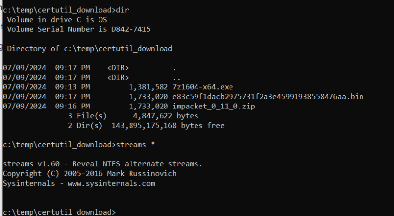 A DFIR artifact that you may expect to find is a “Zone.Identifier” ADS, but those are not created by certutill. So, you cannot rely on only that ADS to detect downloaded files.