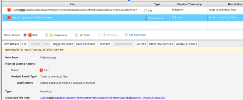 Cyber Triage’s automated scoring aids investigators by quickly bubbling up notable artifacts. One such example is related to process execution of certutil with suspicious arguments for downloading files.