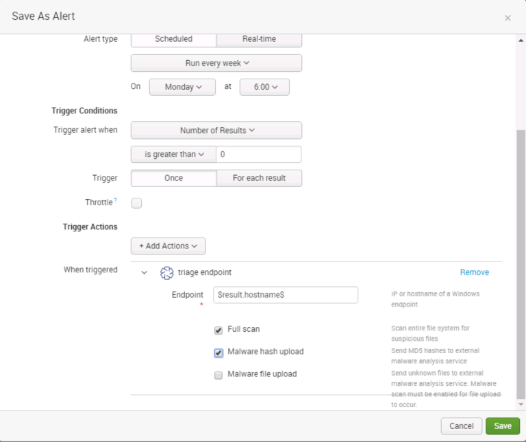 To configure Splunk to start a Cyber Triage investigation based on an alert, add a “Trigger Action” to your Splunk alert configuration. Choose the Cyber Triage “triage endpoint” action.