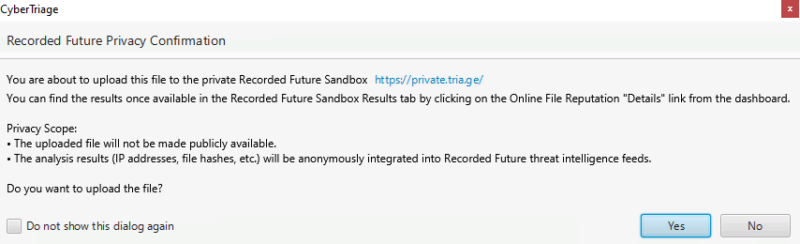 You’ll then get a prompt to review the privacy terms associated with the upload. They are different from those for ReversingLabs. The basic takeaway is that the results will be available in the Recorded Future threat intelligence feed, but not associated back directly to you.