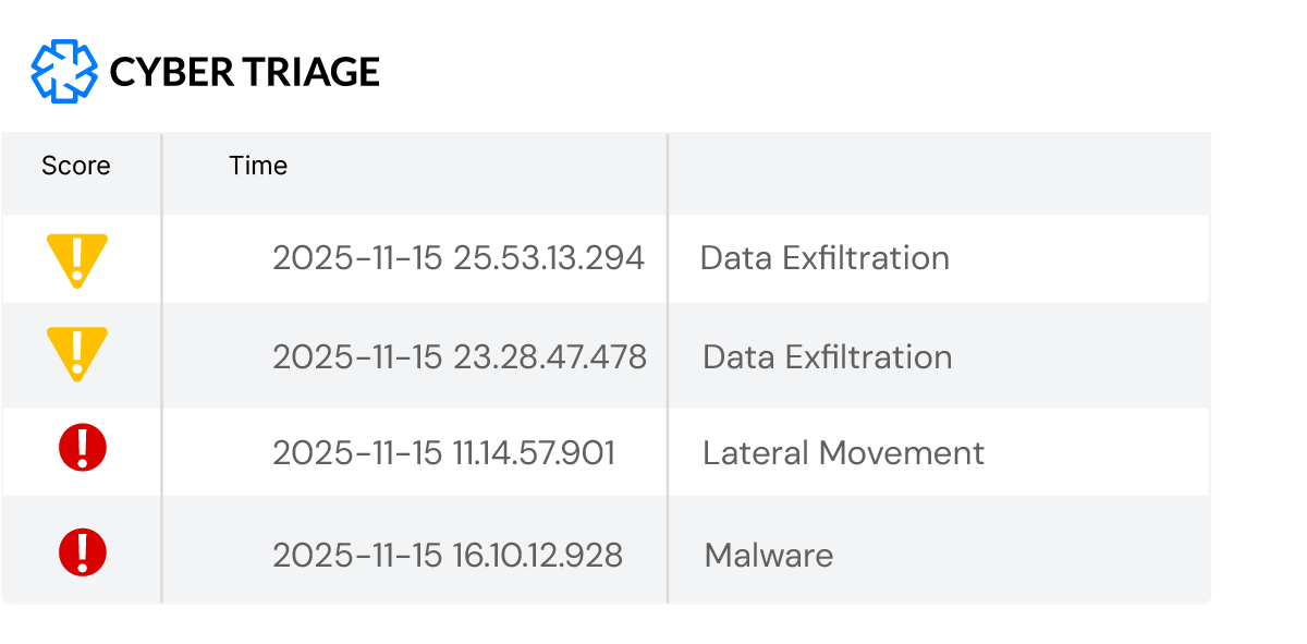 Try Cyber Triage to see how it will make your intrusion investigations faster and more comprehensive. Fill out this form to get an installer. Get started with our scenario data (or your own).