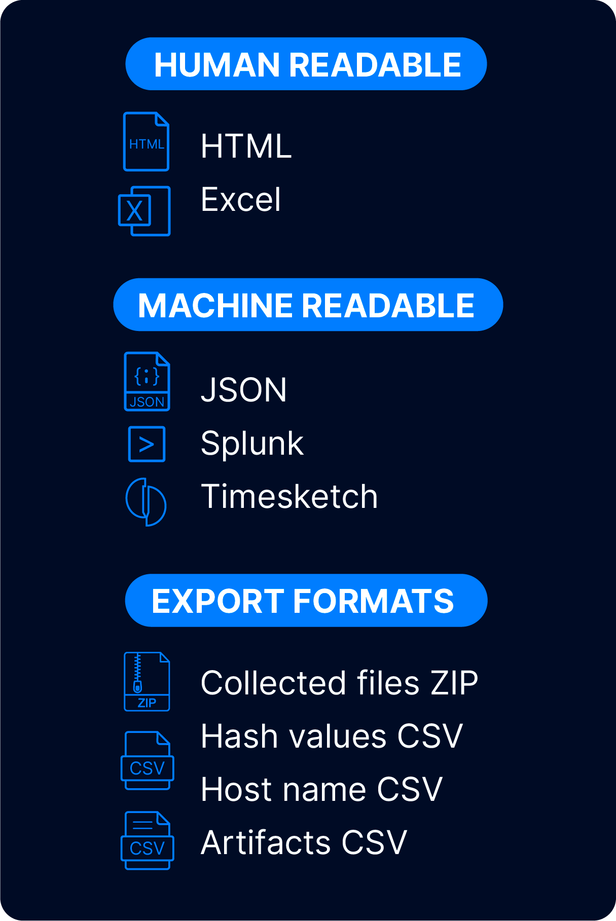 We know you may want to use other DFIR tools in addition to Cyber Triage. We allow you to export all of your collected data in other standard formats.