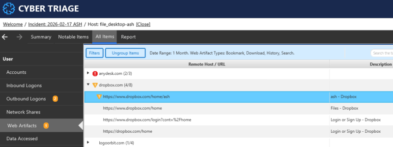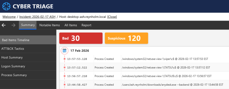 Cyber Triage imports the past 30 days of EDR telemetry (typically 300,000+ events) and begins scoring each artifact as bad, suspicious, or benign.