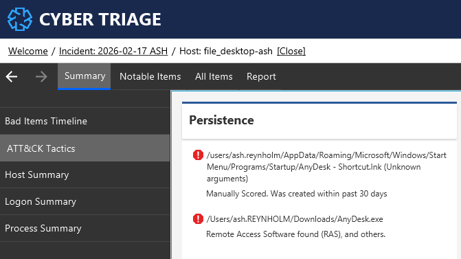 As an example, one of the suspicious items was a triggered task that provided persistence for the remote access software. When the analyst marks that as “bad”, then Cyber Triage will also recommend: